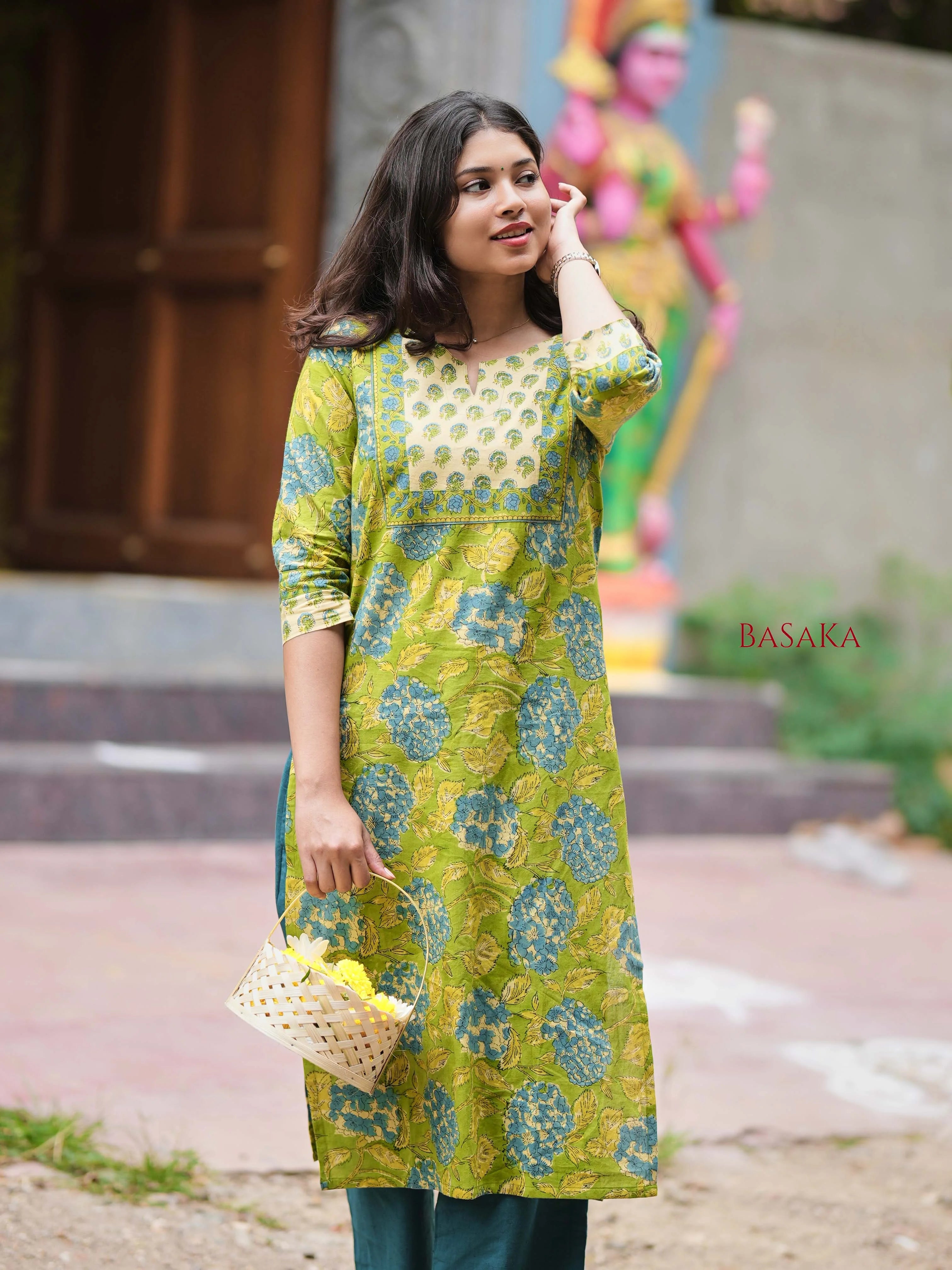 Parrot Green Blossom A-line COTTON Kurta