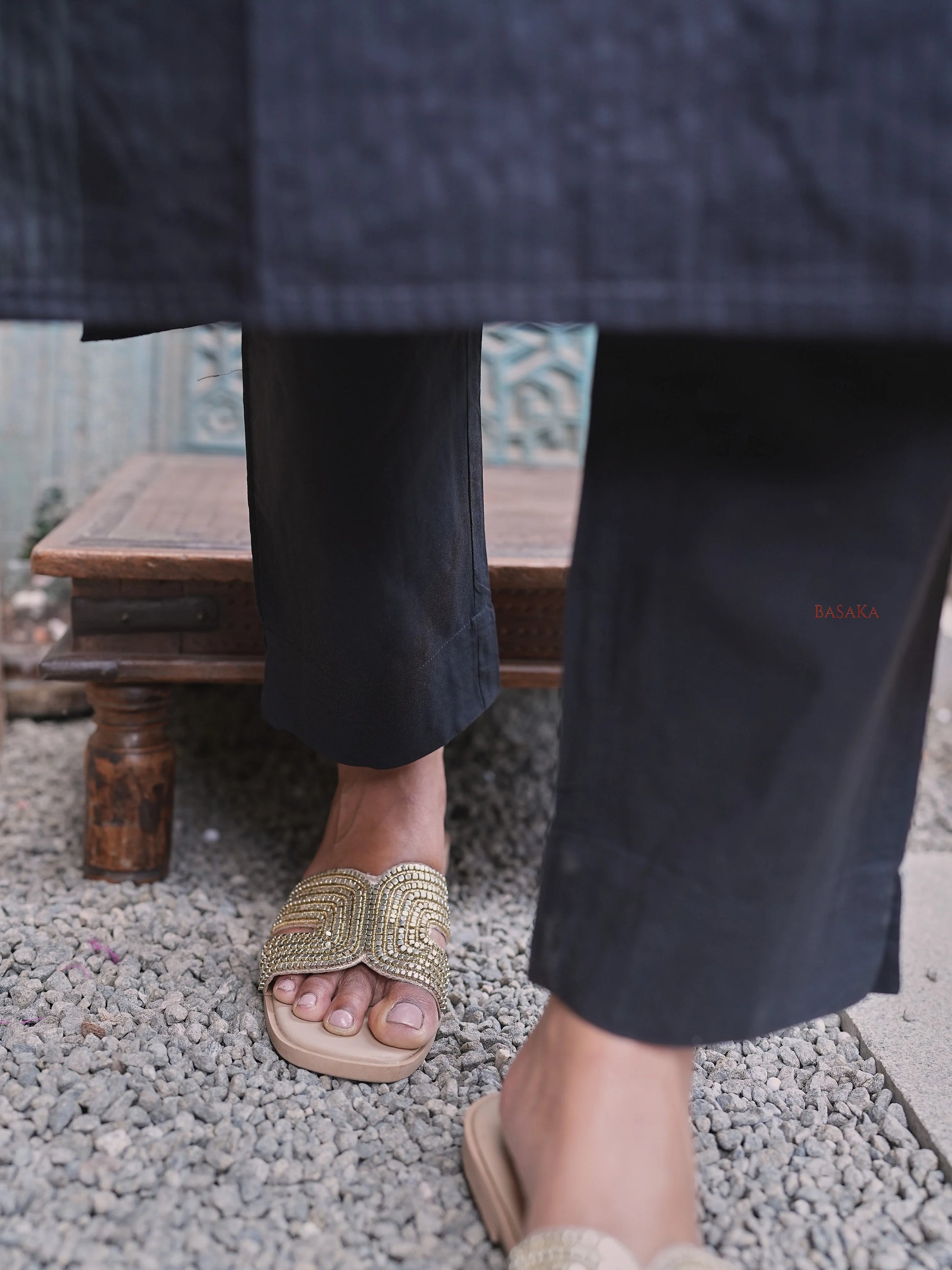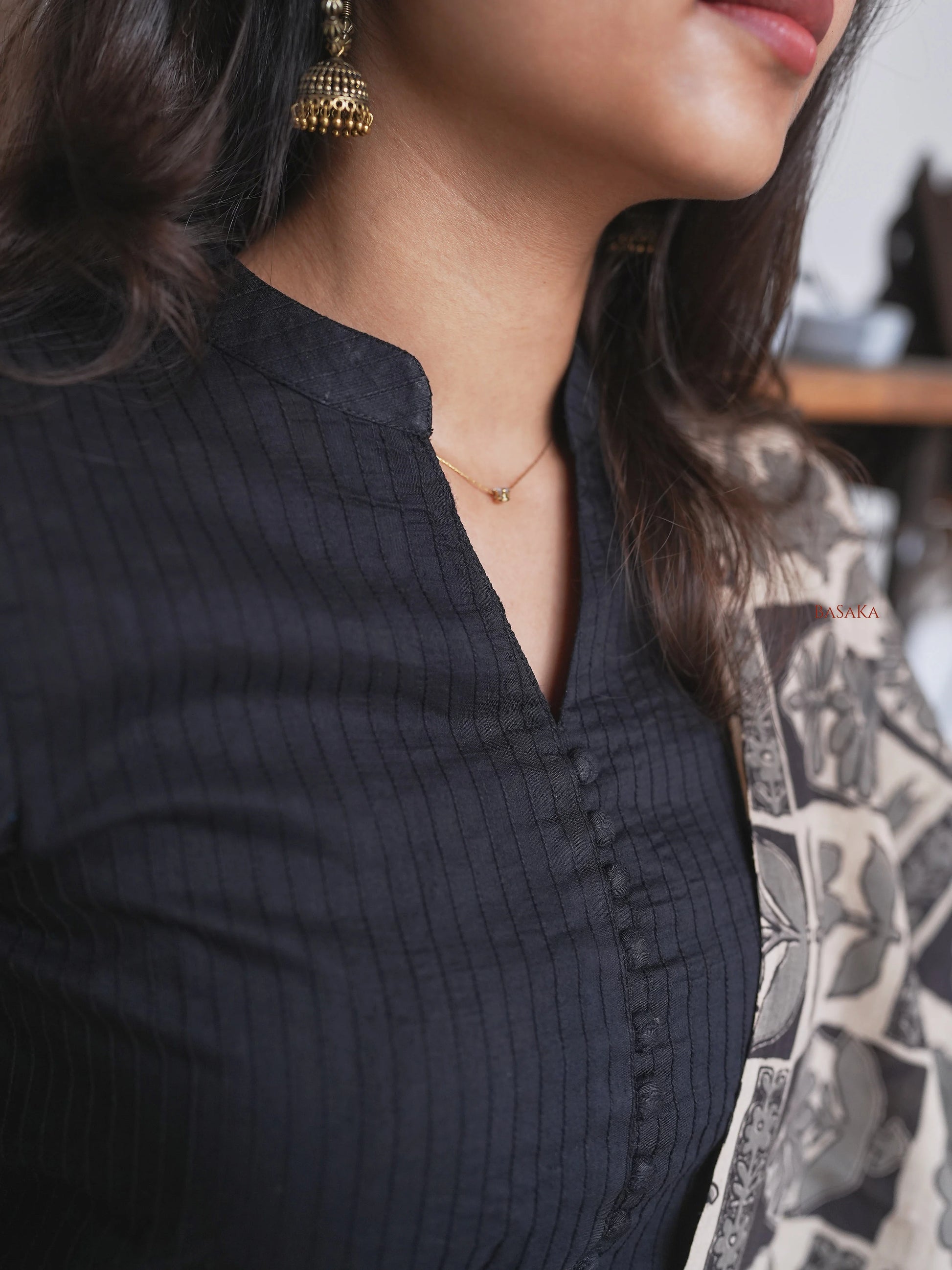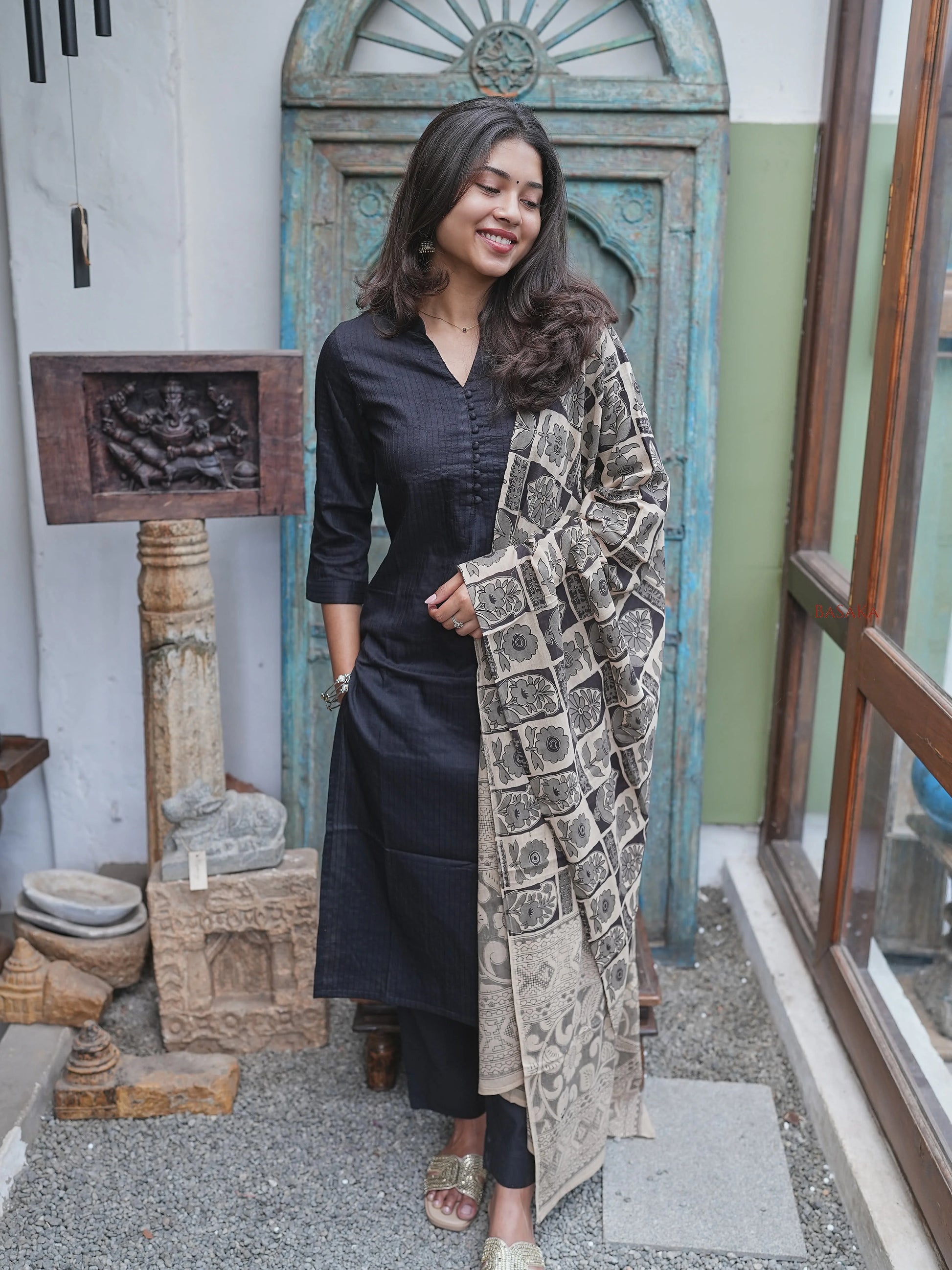 Our Black Kalamkari South Cotton Suit Set, crafted from pure South cotton, features pintuck detailing for a subtle, elegant look.
