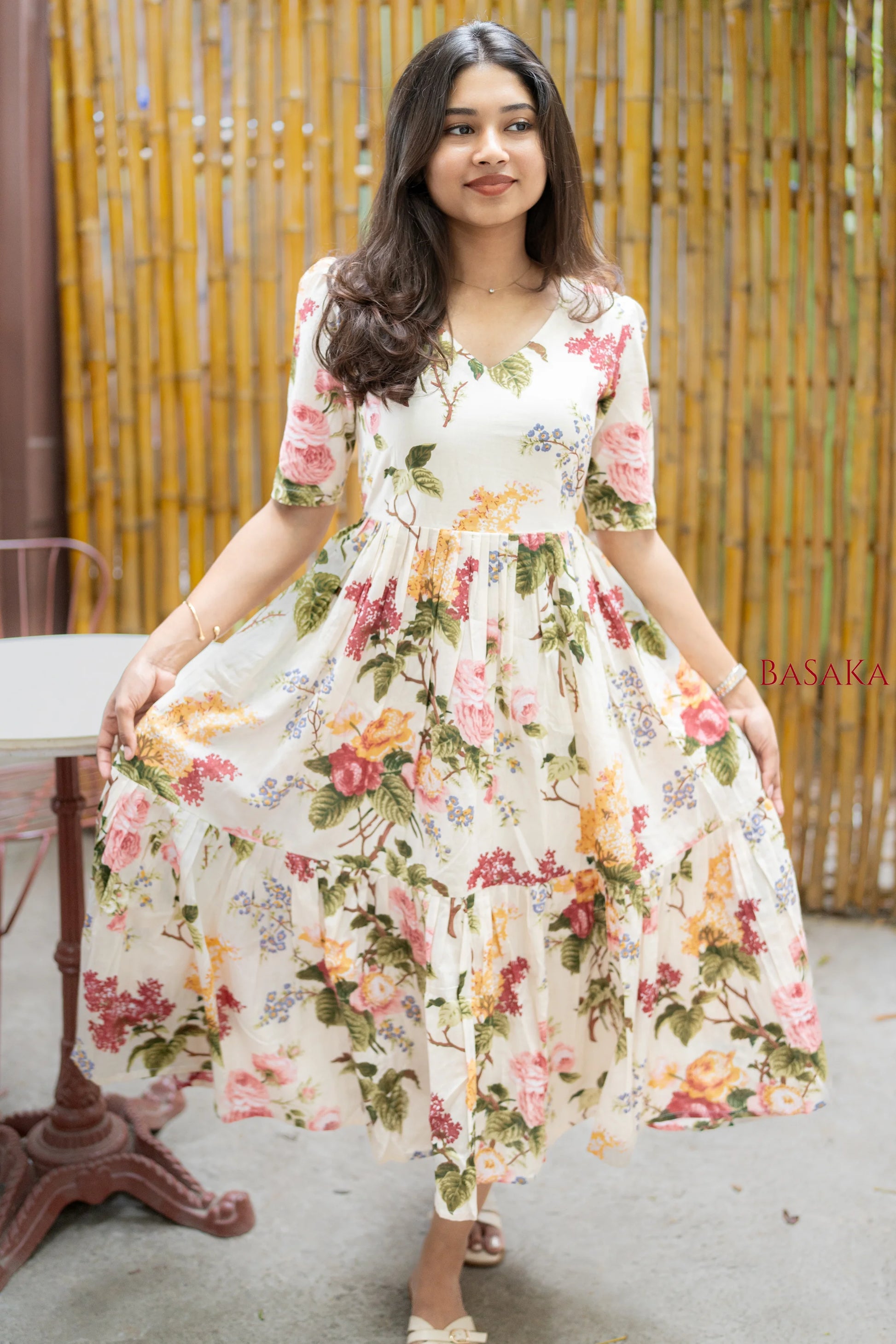 - Our Mul-Mul Botanical Dream Off-White COTTON Dress is adorned with graceful floral motifs