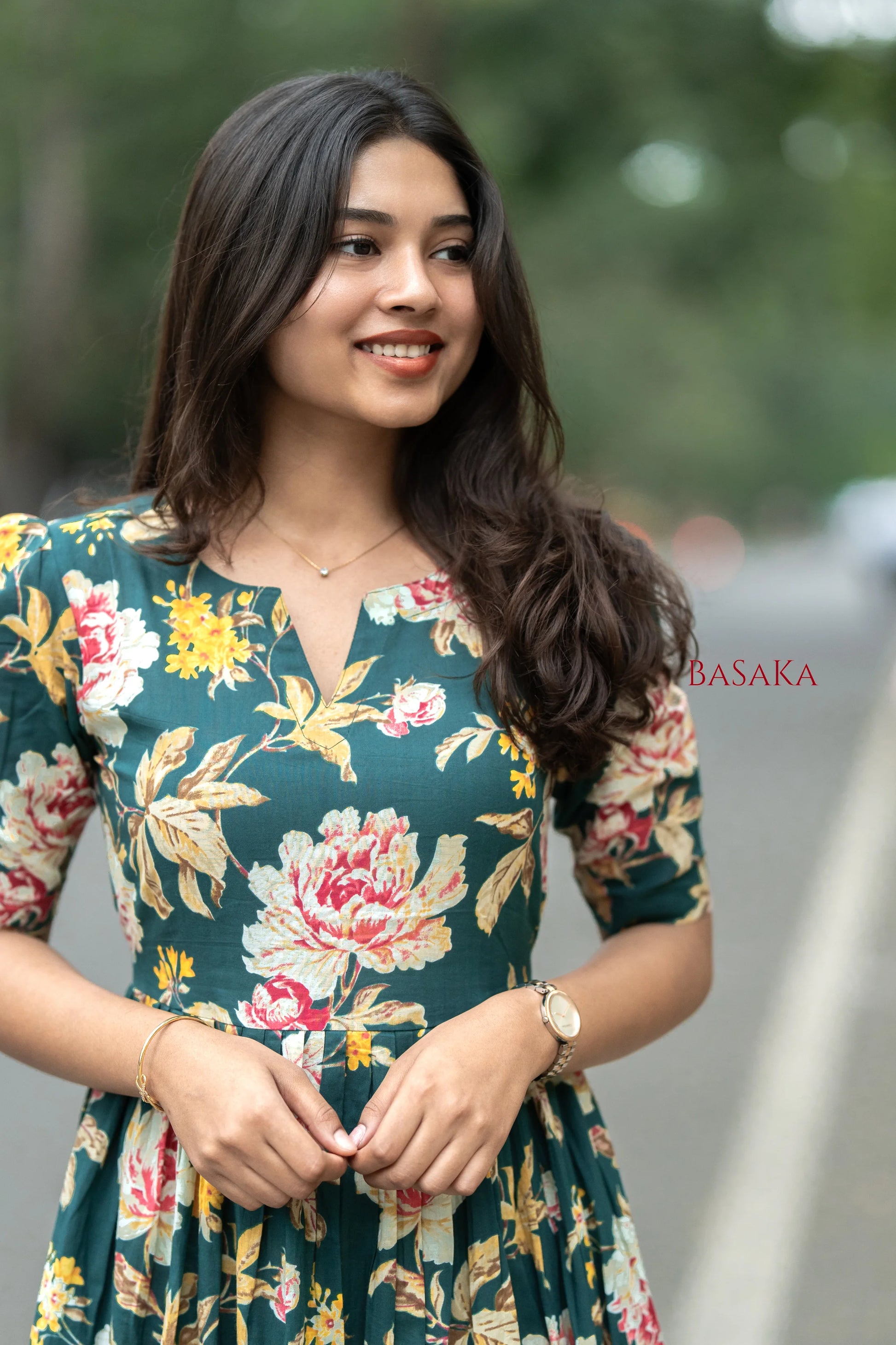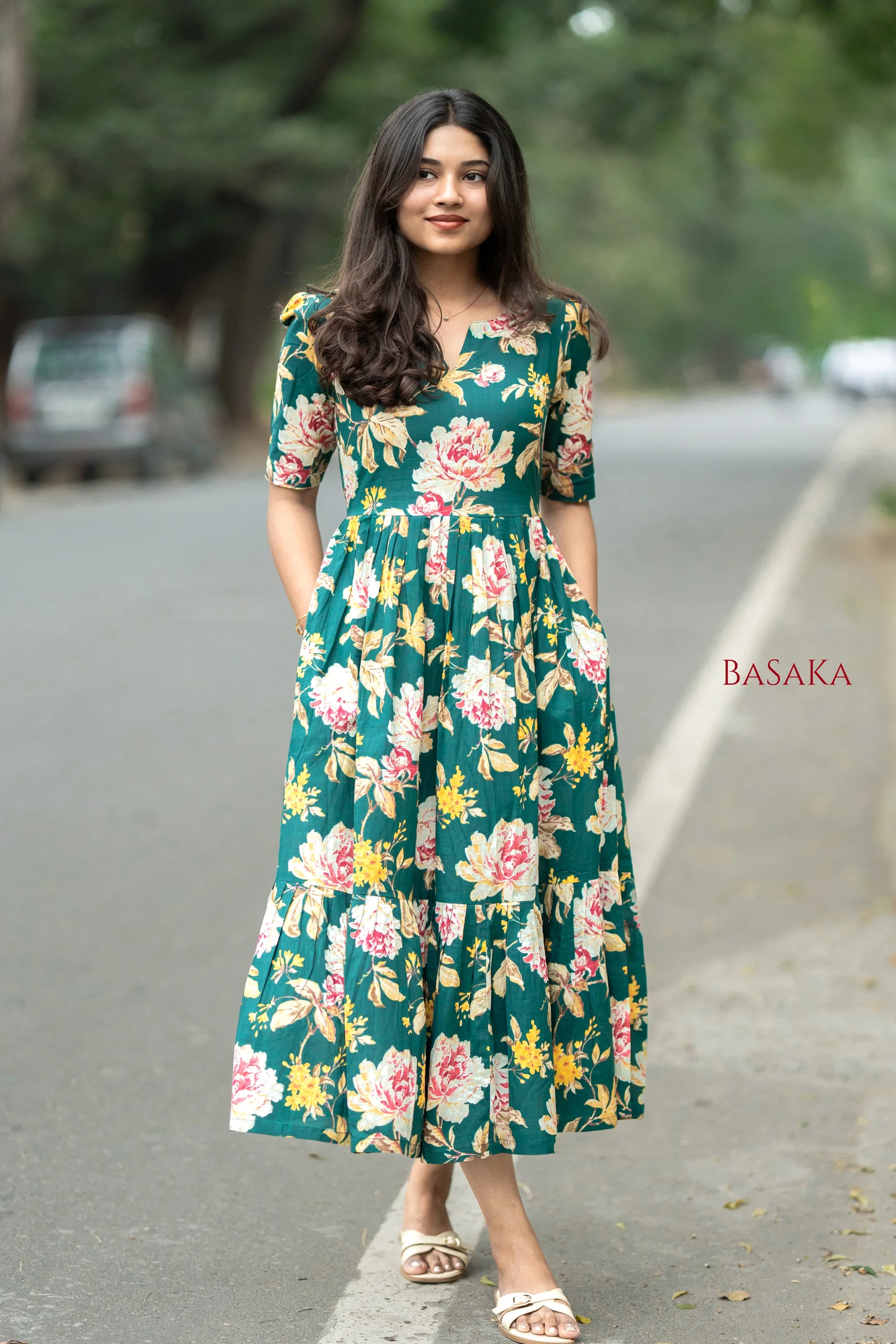 - Our Emerald Carnation Bloom COTTON Tiered Dress is adorned with graceful floral prints