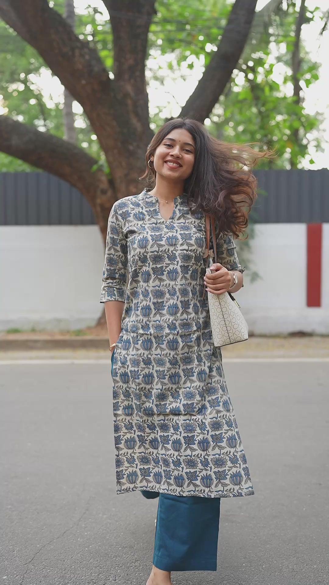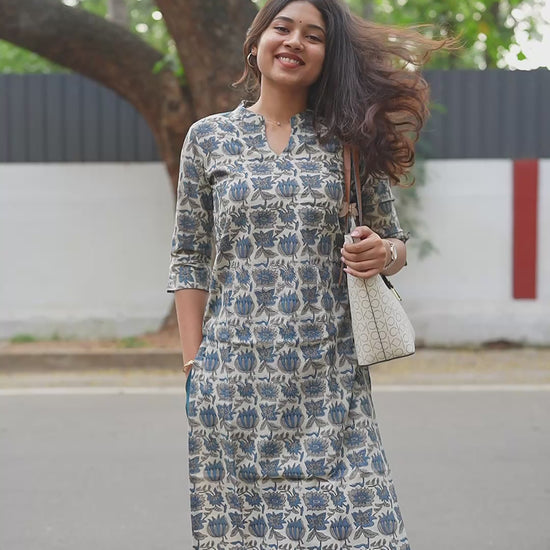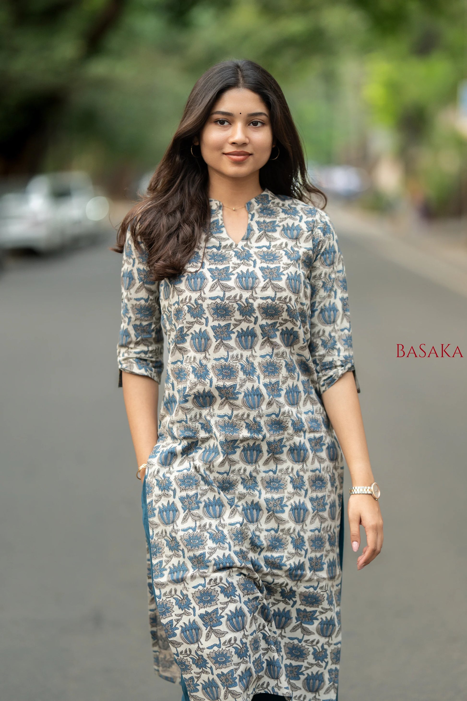 Print: Indigo Blue Lotus Block Printed Cotton Kurta in natural blue & grey tones