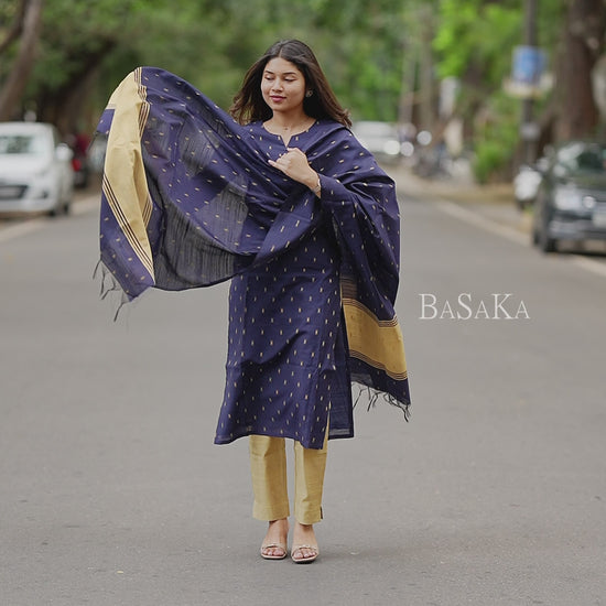 A matching Same & Contrast Colour golden & Navy Blue dupatta (2.4 mtrs) completes this timeless festive ensemble.