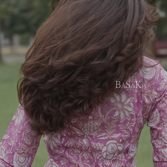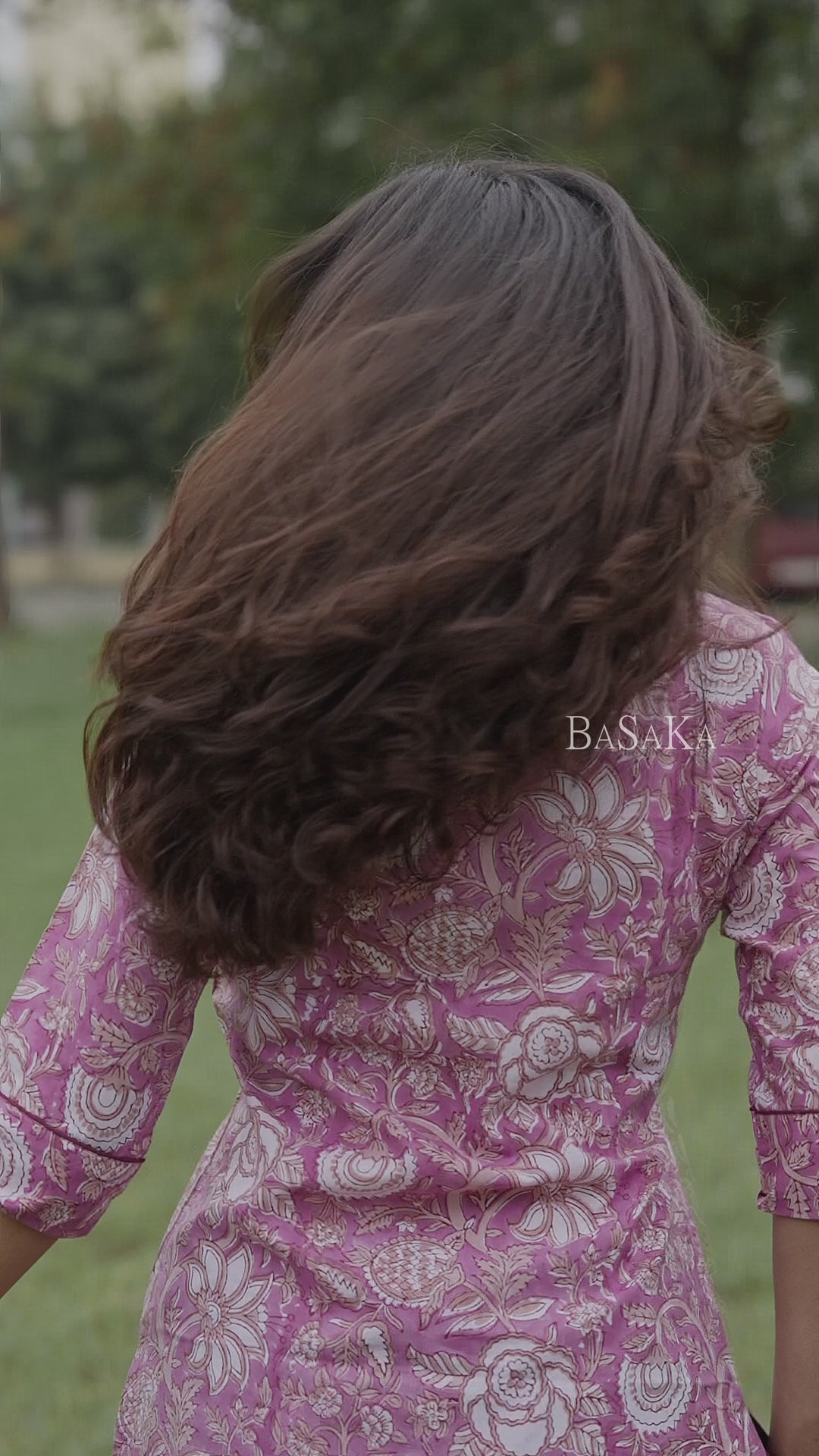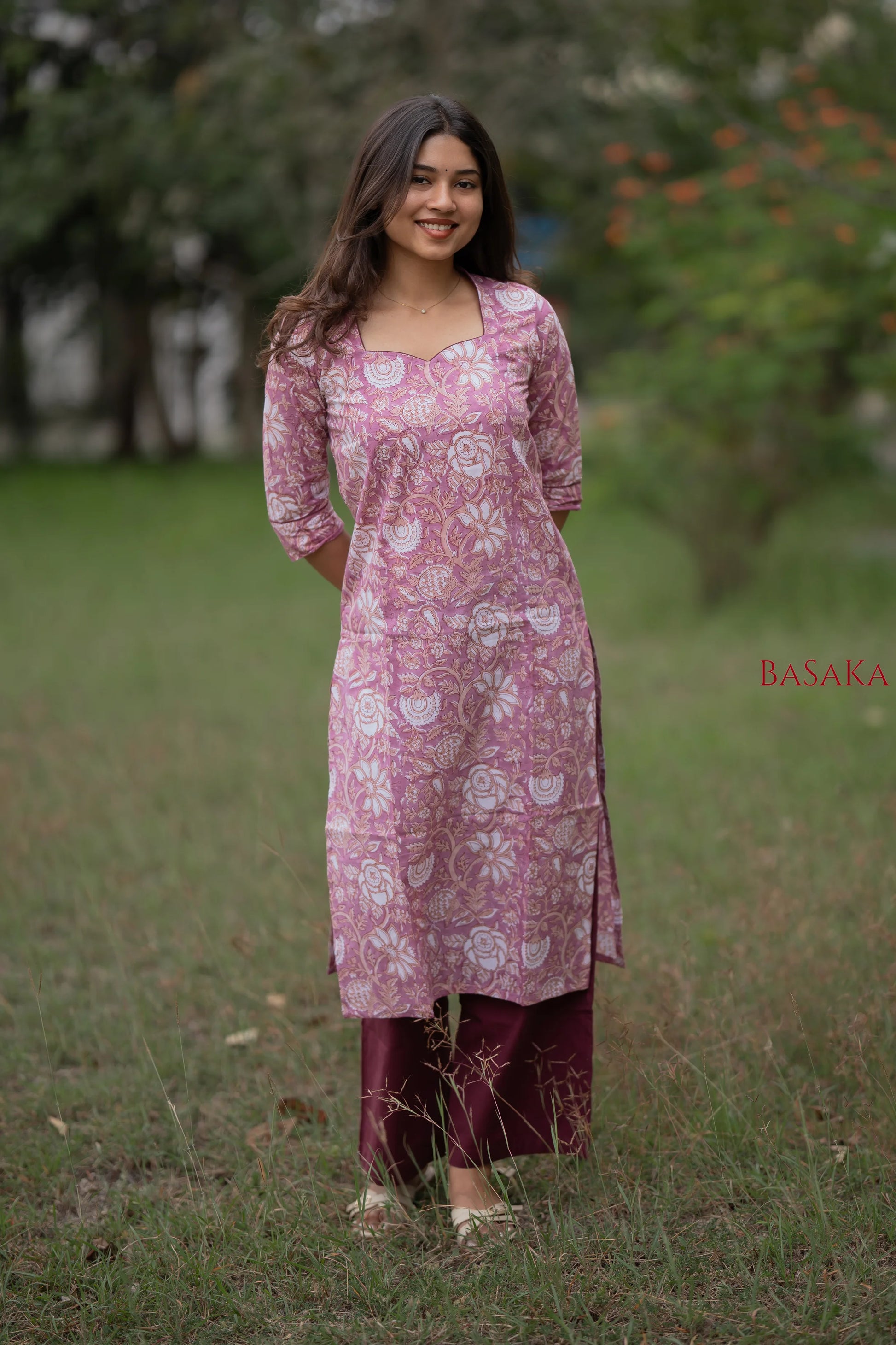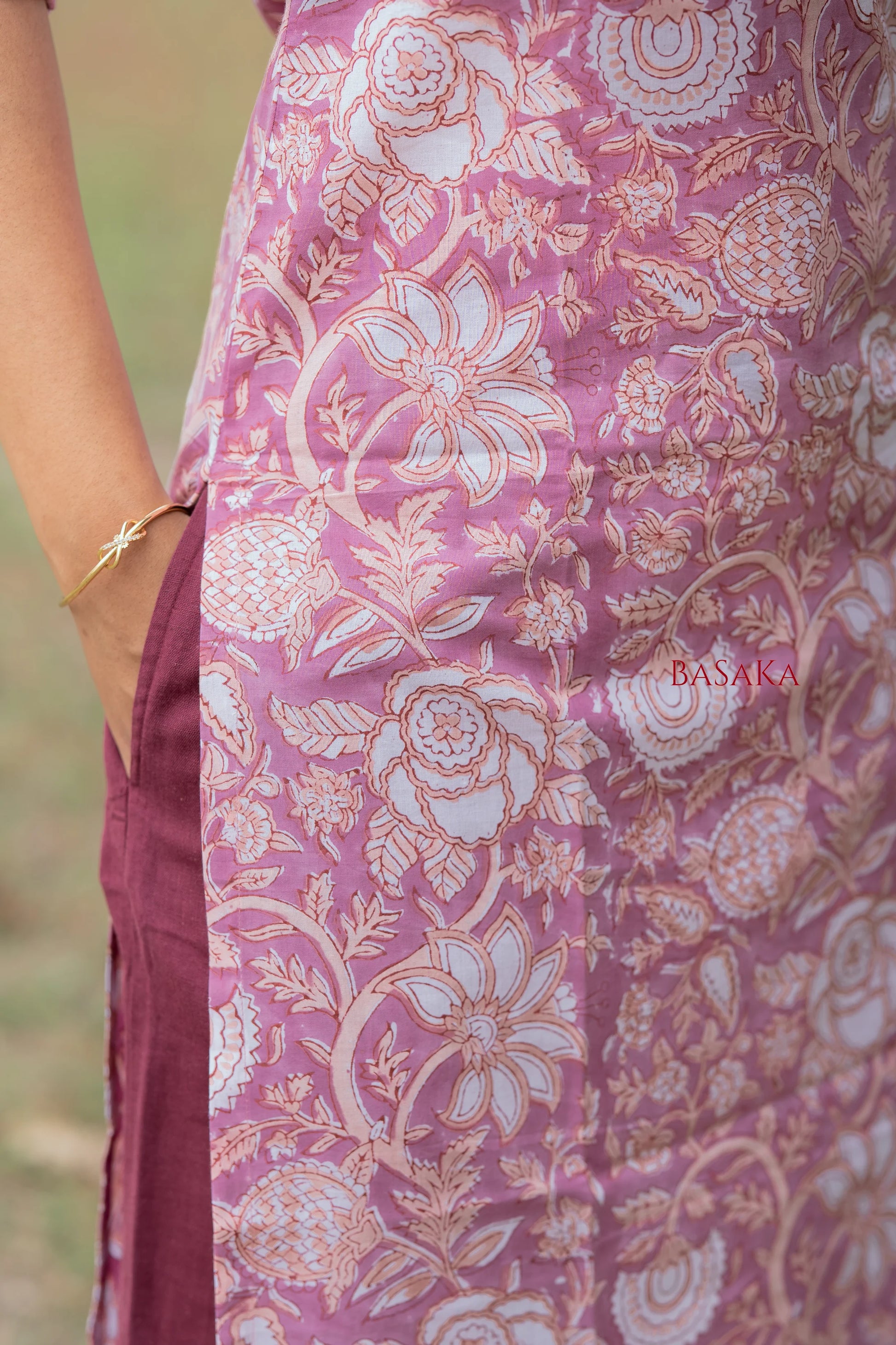 Print: Soft Pink Floral Block Printed cotton Kurta in natural Soft Pink & Earthy Brown tones with pipping