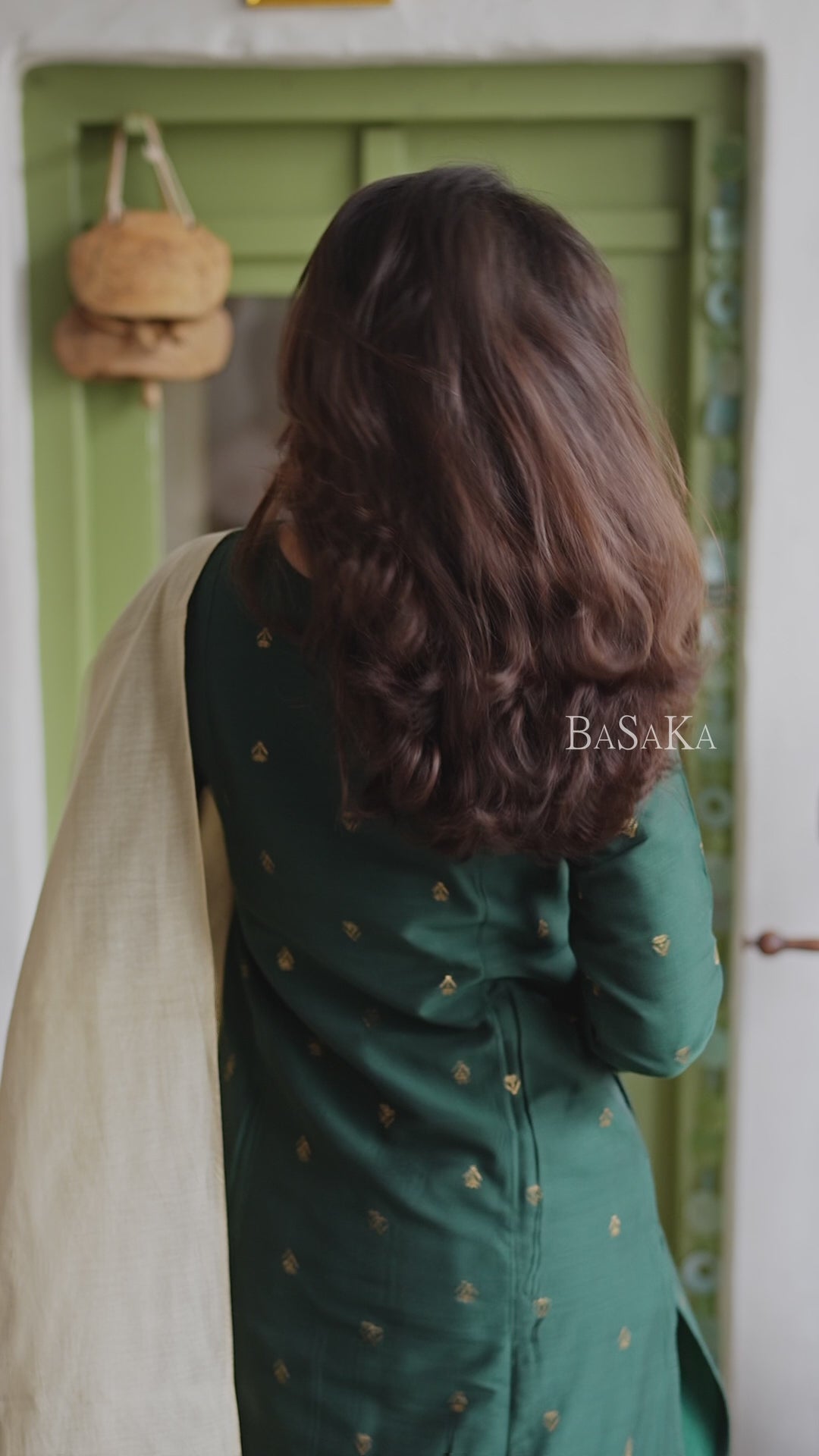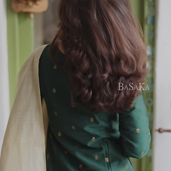 Our Soft Raw Silk Bottle Green Aline Kurta Set, crafted from a soft raw silk blend, features an elegant texture and subtle sheen, perfect for a sophisticated festive look.