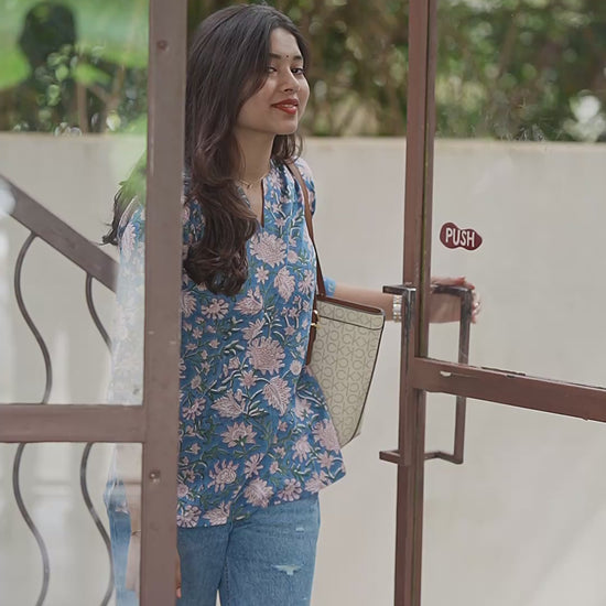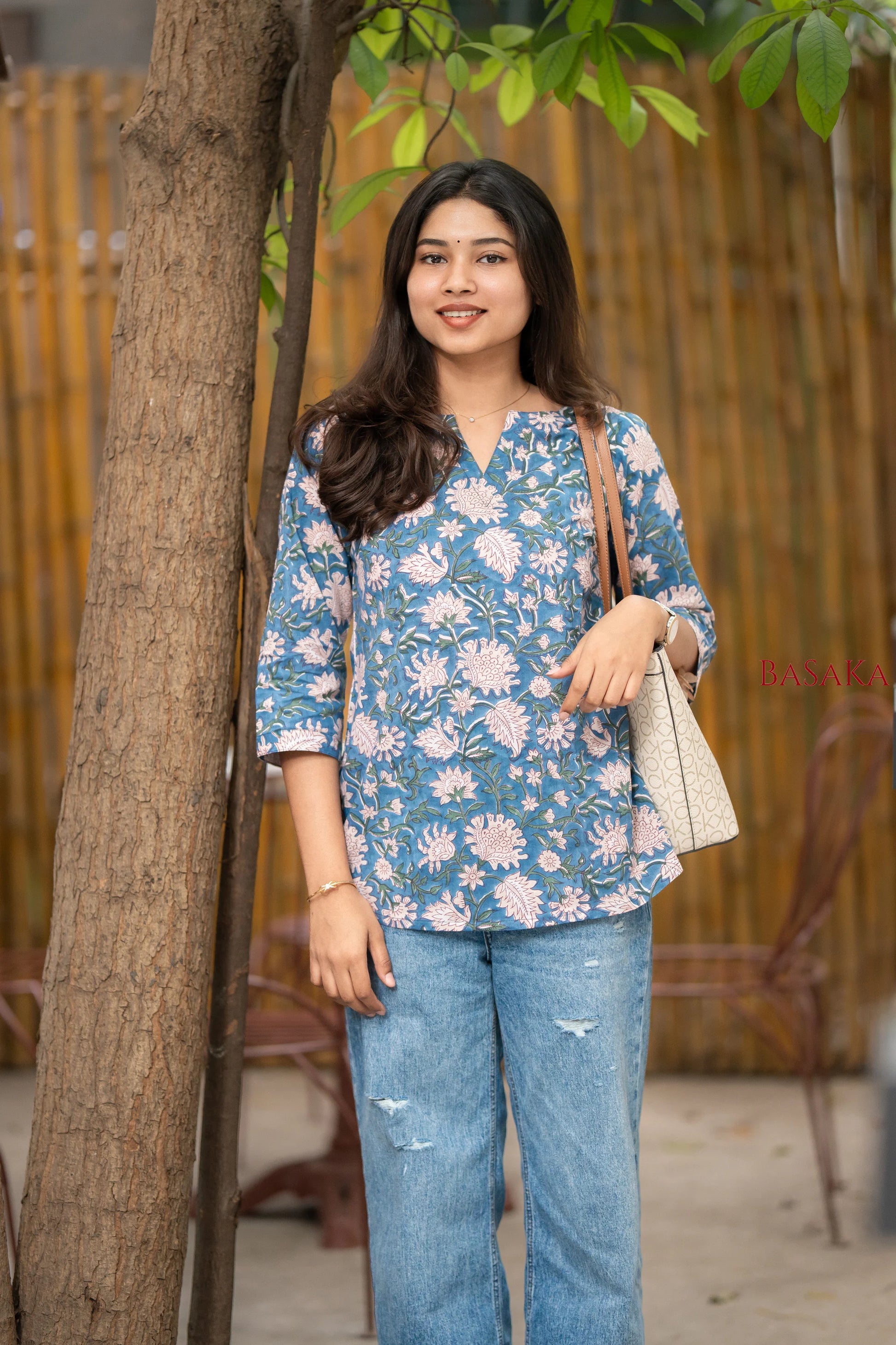- Our Steel Blue Printed Block Printed Top comes adorned with floral prints